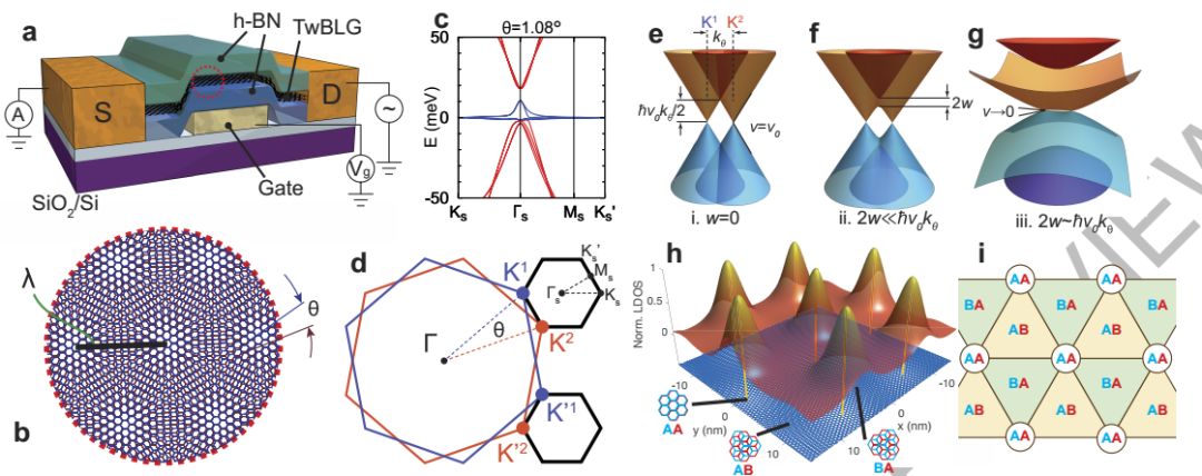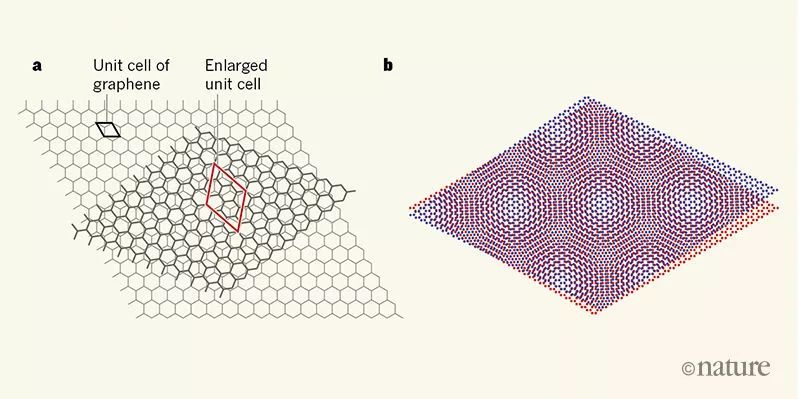 Cao等人发现,堆叠的双层石墨烯中,电学行为对原子排列非常敏感,影响层间电子移动。对于物理学家而言,电学行为通常是由能量主导。而在这项研究中,单层石墨烯内原子间电子移动有关的能量在eV量级,而在层间的电子移动涉及的能量量级最多在几百meV。 要想解开这个谜题,对称性是关键! 对于结构高度有序的单层石墨烯而言,电学性能取决于对称性。研究人员制备了旋转扭曲的双层石墨烯,通过电子之间的相互作用来控制整个体系的电子态。旋转产生的位错使石墨烯层中的电子能带结构不再对齐,单胞变大。