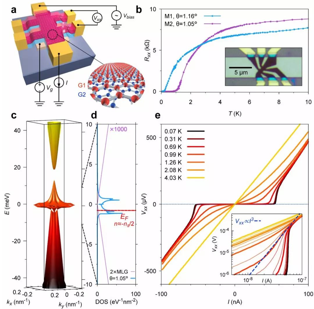 研究人员发现,扭曲的双层石墨烯会产生两种全新的电子态。一种电子态是Mott绝缘体态,来源于电子之间的强排斥作用。另一种是超导态,来源于电子之间的强吸引作用而产生零电阻。 当旋转角度小到魔角时(<1.05°),扭曲的双层石墨烯中垂直堆叠的原子区域会形成窄电子能带,电子相互作用效应增项,从而产生非导电的Mott绝缘态。在Mott绝缘态情况下加入少量电荷载流子,就可以成功转变为超导态。