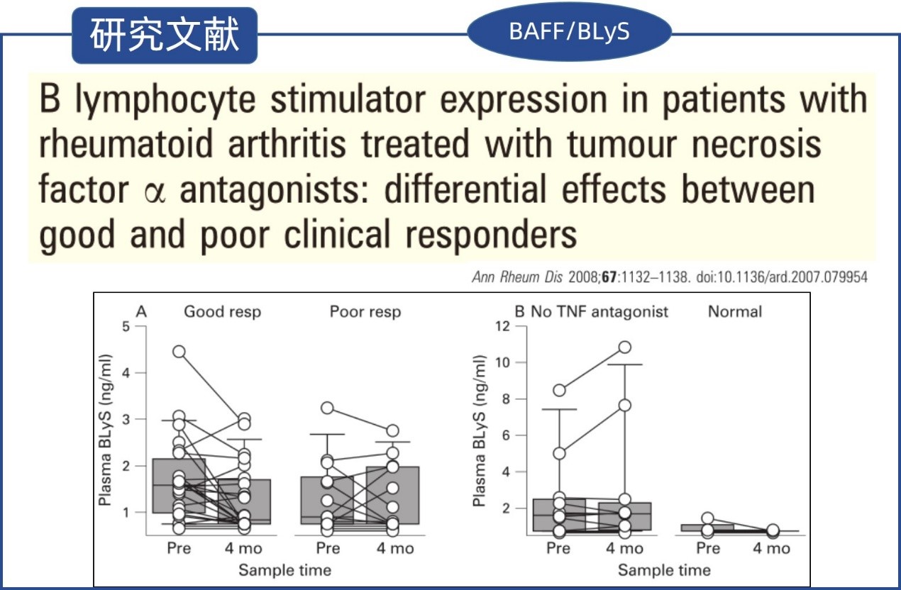 研究对象:综合3个因素评分,将患者分为Good responders和Poor responders实验组、对照组及正常人。经过4个月TNF拮抗剂治疗,用ELISA检测患者血清样本BAFF表达情况。研究结论: Good responders实验组患者血清中BAFF表达量明显下降。对照组和正常人血清中BAFF量无明显变化。