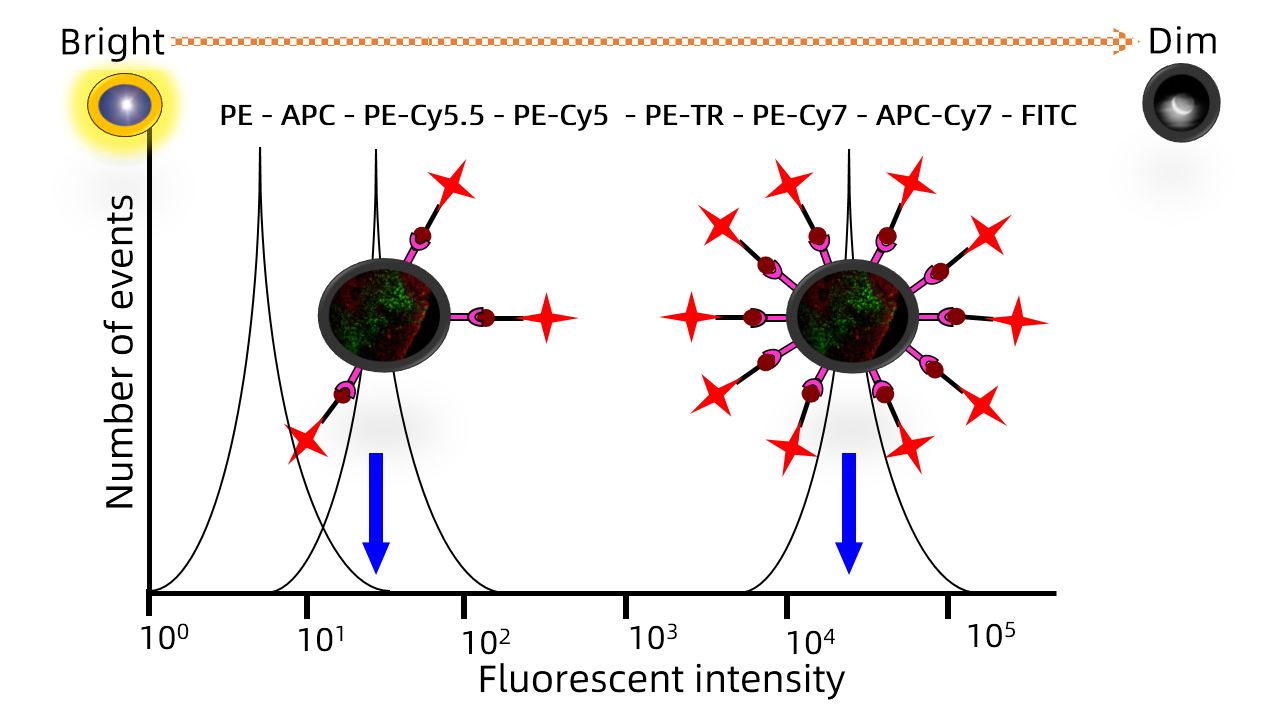 低表达抗原,推荐使用亮荧光染料;高表达抗原,推荐使用弱荧光染料。
