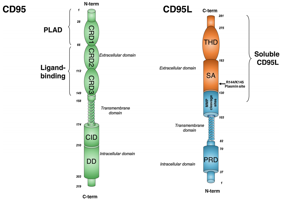 Fas/CD95是一种319个氨基酸的I型跨膜糖蛋白, 是死亡受体(DR)家族中的一员。该受体含有胞外氨基末端富含半胱氨酸的结构域(CRD),决定了其配体特异性,以及位于细胞质的一个保守的80个氨基酸序列,称为死亡域(DD),这是诱导细胞凋亡所必需的。其对应的配体CD95L(FasL/CD178)是一种Ⅱ型跨膜蛋白,具有细胞质结构域、跨膜结构域、茎段和C端TNF同源结构域(THD)。THD介导CD95 L的同源三聚体化和与CD95的结合。CD95L可以被MMP在茎部切割,也可被纤溶酶在SA部位切割,形成可溶性形式s-CD95L(图1)。s-CD95L与CD95结合不发挥凋亡信号。