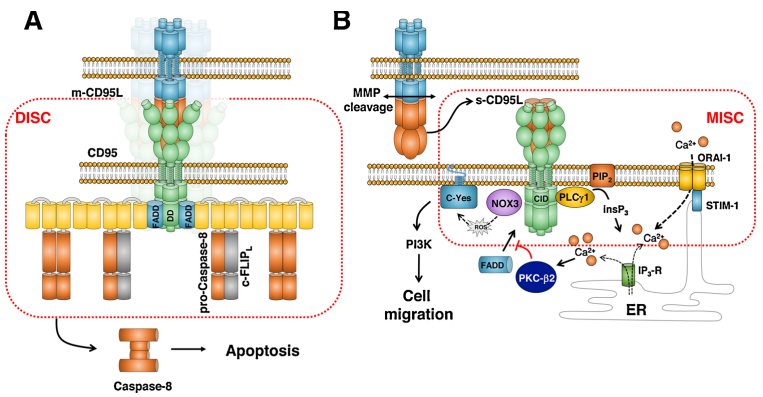 m-CD95L与CD95相互作用后,通过胞质内同型DD介导的相互作用募集通过同型DD介导的相互作用募集具死亡结构域的Fas相关蛋白(Fas-associated protein with death domain,FADD)。FADD通过死亡效应域(DED)介导的相互作用,招募蛋白酶caspase-8和caspase-10以及凋亡细胞FADD样IL-1β转换酶抑制蛋白(apoptosis cellular FADD like interleukin-1-β-converting enzyme-inhibitory protein ,c-FLIP)。这些蛋白质共同形成了死亡诱导信号复合物(DISC)(图2A)。 CD95也可诱导非凋亡信号通路。可以参与NF-κB和p38、ERK和JNK MAPK等非凋亡信号通路,促进细胞增殖、存活,迁移和细胞因子的产生。CD95介导的凋亡和非凋亡信号通路共享许多因子,如凋亡因子FADD和caspase-8,它们也是m-CD95 L刺激后NF-κB活化所必需的。Caspase-10和cFLIP似乎也参与了CD95介导的非凋亡信号通路的诱导。 另外,研究表明可溶性三聚体s-CD95 L与CD95的结合诱导形成一种替代信号复合物,从而导致细胞迁移,因此将其命名为运动诱导信号复合物(MISC)(图2B)。MISC的形成依赖于磷脂酶Cγ1(PLCγ1)向CD95膜近端胞内结构域(CID)的募集。所涉及的其他成分见图2B。 Fas和TRAIL受体在肝细胞癌、肾癌和卵巢癌等多种癌症类型中的表达显著升高,这表明这些受体的表达对此类肿瘤有利。结肠癌、乳腺癌和肾癌细胞系中的CD95通过凋亡独立的程序诱导非CSC向CSCs的转化,并且使这些细胞对CD95介导的凋亡程序具有抵抗力。从分子的角度来看,CD95在干细胞中的作用与PI3K/Akt和MAPK通路的激活有关。此外,刺激癌细胞中的CD95可诱导I型干扰素(IFNα或IFNβ)的分泌,其与IFN I型受体(IFNAR1和IFNAR2)相互作用,并激活STAT1影响癌症预后。 覆盖新生血管的内皮细胞可能是CD95L的主要来源,肿瘤组织中内皮细胞表达的CD95L代表一种物理屏障,杀死CD8+T细胞,同时保留T调节(Treg)细胞,后者在肿瘤中的积聚可能会导致免疫抑制。 转移性疾病仍然是癌症患者死亡的主要原因,占癌症相关死亡人数的90%。越来越多的证据表明CD95是转移性扩散的关键调节因子。TRAF2与caspase-8一起可能参与CD95介导的迁移过程。TRAF2过表达在胰腺肿瘤细胞中触发了一个正反馈环,因为暴露于CD95L会激活NF-κB信号,而NF-κB信号又反过来促进了TRAF2在肿瘤细胞中的过度表达。在CD95 L存在下,过度表达TRAF2的胰腺肿瘤细胞可诱导分泌MMP2和MMP9、uPA和IL-8,这些因子参与侵袭过程。CD95的参与导致胞质Ca2+浓度的快速、局部和短暂的增加,负向控制CD95凋亡信号,并通过c-yes/PLCγ1/IP3/SOC通道/Ca2+/PI3K信号促进细胞迁移和转移。 由于Fas/CD95启动凋亡,参与免疫稳态,不仅在癌症中有作用,在其他免疫性疾病中如淋巴增生综合征、多发性硬化、类风湿关节炎、系统性红斑狼疮等也发挥重要作用。 杭州联科生物技术股份有限公司,ELISA自主研发近十年,每月都有新品推出。十月新品除Fas/CD95外,还包括sL-Selectin、CXCL16、PD-L1。详细介绍将会陆续推出。