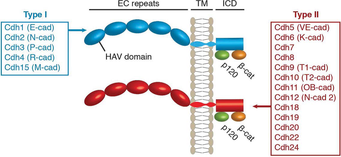 钙粘蛋白(cadherin)属于细胞粘附分子家族,是一个跨膜或膜相关糖蛋白家族,以钙离子依赖的方式介导特定的细胞-细胞粘附,使细胞与环境相互作用,在多种器官的形态发生中起关键作用,在免疫监视、外渗、运输、肿瘤转移、伤口愈合和组织定位等方面帮助细胞与其他细胞进行通讯。钙粘蛋白家族至少由五个主要亚家族组成,即I型经典钙粘蛋白、II型钙粘蛋白、桥粒钙粘蛋白、原钙粘蛋白和多种钙粘蛋白相关分子。