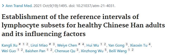 来自复旦大学附属中山医院、北京大学第一附属医院和广州中医药大学附属第二医院的研究团队合作,进行了一项针对中国多中心人群的研究。该研究募集了表观健康人群的血液样本进行TBNK检测分析,旨在建立认可度更高、更科学的成年人TBNK参考区间。2021年10月,该研究的成果发表于Annals of Translational Medicine,题为《Establishment of the reference intervals of lymphocyte subsets for healthy Chinese Han adults and its influencing factors》。