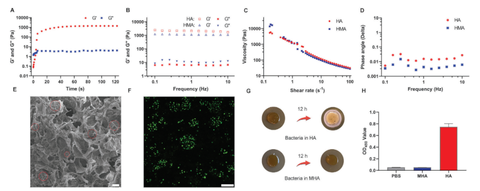 进一步地,研究团队探讨了MHA-LR的特性。他们发现,MHA-LR凝胶体系具有快速凝胶化能力和网络的完整性及稳定性;含微球的水凝胶和不含微球的水凝胶之间没有显著差异;能阻止了细菌逃逸到当地环境中。这些结果表明含有活细菌的水凝胶在微球中具有良好的生物安全性,可以避免潜在的细菌感染。