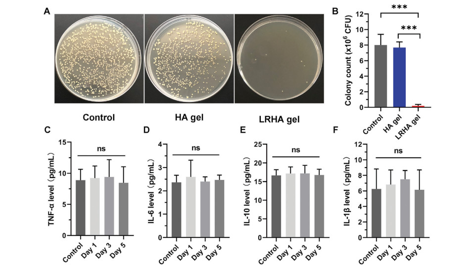 接下来,研究团队以小鼠为模型,评价活菌水凝胶在体内的抗菌能力。结果显示,经罗伊氏乳杆菌水凝胶处理后,破损处皮肤的细菌生长情况得到良好抑制。此外,通过分析植入含有罗伊氏乳杆菌材料的小鼠炎症细胞因子,评价MHA-LR的生物相容性。结果显示,对照组与植入活菌水凝胶组的所有炎症因子仅有微小差异。