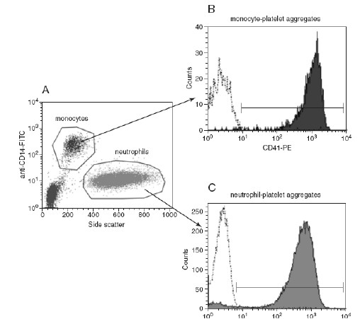 临床研究发现,稳定性冠状动脉疾病和静脉血不足时,循环血液中的单核细胞-血小板聚集物(而不是中性粒细胞-血小板聚集)是比检测血小板活化指标--CD62p 更加敏感的体内血小板活化标志。