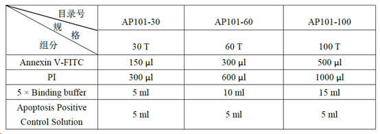 注:本产品不适用于自动调电压的流式细胞仪,如 BD 的 C6;如需用于此类仪器,推荐 Annexin V-FITC/PI apoptosis kit (C6 专用) (AP101C)。