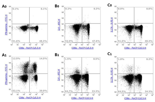 Flow cytometric analysis of Human Th1/Th2/Th17 Staining Kit. The staining pattern of IFN-g , IL-4 and IL-17A on resting heparin anticoagulated blood (A0, B0 and C0). PMA/Ionomycin stimulated heparin anticoagulated blood (A1, B1 and C1). Dot plot analysis are derived from gated CD3+/CD8- cells population. Flow cytometry was performed on a Thermo Fisher Attune NxT. The health status of the volunteers is unclear.