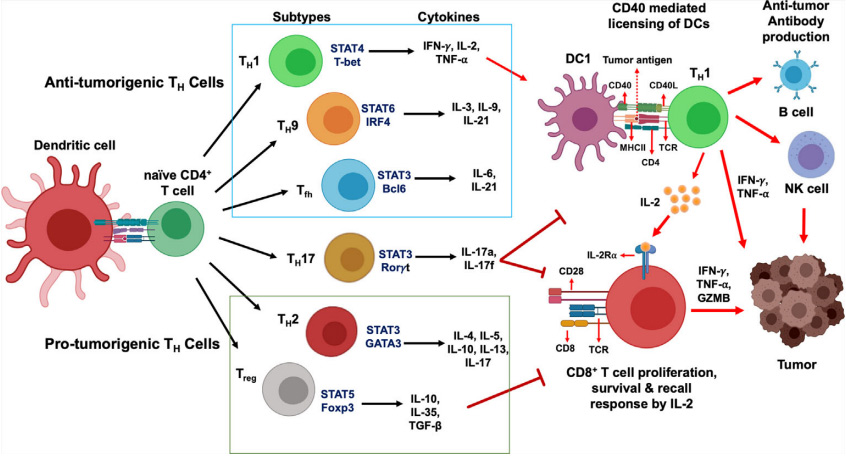 辅助性T细胞 (T helper cell, Th)由Naïve CD4+ T细胞受到特定刺激(抗原、细胞因子)后分化而来,包括 Th1、Th2、Th17及调节性T细胞(Treg)等。