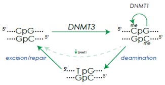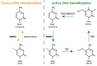 CpG位点被三种DNA甲基转移酶(DNMTs)中的一种甲基化。在胚胎形成期,重新甲基化由DNMT3A和DNMT3B调控,两者具有类似结构,由PWWP结构域、PHD样或ADD结构域,以及羧端催化域组成。PWWP结构域是DNMT3A和DNMT3B在体内与染色质结合所必需的。DNMT3L缺少了PWWP和功能性的催化域,可与DNMT3A或DNMT3B形成异二聚体,促发其重新开始的配体的活性,引导DNA的识别。DNMT3L的PHD结构域与组蛋白H3的N端作用,只在与未甲基化DNA结合时才被激活。合适的组蛋白修饰组合可为重新甲基化复合物的对接创造保护或许可的条件。SETD1在赖氨酸第4个残基(H3K4)的特异性甲基化则会抑制DNMT3L的结合。H3K4甲基化是活化基因的标志,并且启动子中的三甲基化H3K4和DNA甲基化之间呈负相关。的确大部分未甲基化CpGs的染色质富含H3K4二甲基化和三甲基化。某些印记基因的启动子要发生DNA甲基化则必须由组蛋白脱甲基酶LSD2(KDM1B)先将H3K4甲基化去除。此外,组蛋白H3的第36位赖氨酸(H3K36me3)的SETD2三甲基化促使DNMT3A结合,而H3K36me3脱甲基酶KDM2A与未甲基化CpGs结合可除去H3K36me3。 为了维持基因转录的活化或失活状态,胚胎发育期DNA甲基化模式严格地通过体细胞分裂进行拷贝。DNMT1表达于各种组织,负责维持CpG甲基化的细胞水平。在UHRF1指导下,其可识别半甲基化的DNA,并对复制时新合成的子链中的合适的胞嘧啶进行甲基化(图1)。CpG碱基配对可维持随后复制循环时的甲基化。CpG岛在多次的细胞分裂后仍稳定地保持了其总体的未甲基化状态(或可能的甲基化状态),而DNMT1则发挥了部分作用。 在胚胎发育早期,性别决定后,为了重置生殖细胞的专一性,甲基化在整个基因组中被去除,然后在除了CpG岛以外重建。这保证了每一代的全能性更新,重新甲基化。在发育分化过程中,这些标记格外地在启动子或其他基因调控区域积累,抑制某些关键的多能性基因的转录。胚胎早期的去甲基化及随后的重新甲基化对决定体细胞DNA甲基化模式至关重要。一旦建立,体细胞DNA甲基化可遗传给子代,并仍会影响基因表达。甲基化被认为是长期相对稳定的特征,以维持细胞表型。在某些组织中,有明显的一部分CpG岛易于发生进行性甲基化以维持永久细胞系,重新甲基化也会发生在成熟的体细胞中,尤其是异常细胞如癌细胞。 在配子发生期、合子受精后,CpG去甲基化会发生在细胞重排中,保留诱导的多能性。该去甲基化过程需要胞苷脱氨酶和DNA修复机制(图1)。5-甲基胞嘧啶(5mC)的酶脱氨基作用会导致胸腺嘧啶和T:G碱基对错配。在表观遗传重排期间,碱基切除修复机制随后去除胸腺嘧啶,重新恢复C:G碱基配对。5mC的自发脱氨基作用也需要碱基切除修复机制来修复碱基错配。该过程在大多数分化的细胞中是无效的,但5mC的自发脱氨基作用会将所有的CpG二核苷酸序列去除。 最近发现胞嘧啶可被羟甲基化为5-羟甲基胞嘧啶(5-hmC),从而证实了去甲基化的主动机制(图2)。5hmC破坏DNMTs的再甲基化,直到其被DNA修复,因此5hmC被认为是去除甲基化胞嘧啶的中间产物。三种不同的酶家族参与了主动去甲基化:10-11易位(TET)家族、激活诱导胞啶脱氨酶(AID)家族和碱基切除修复(BER) 转葡糖基酶家族。TET为羟基化物,氧化甲基化胞嘧啶使之催化5hmC。AID作用于特异性羟甲基位点,将5hmC脱氨基为尿嘧啶(5hmU),最终通过胸腺嘧啶DNA糖基化酶(TDG)和单链选择性单功能尿嘧啶DNA糖苷酶1(SMUG1)被未甲基化胞嘧啶。