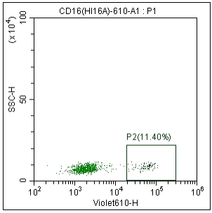 图1. 人外周血染色 Anti-Human CD16, mFluor 610(Clone: HI16a)(F1101609) 的结果。以 FSC/SSC 中的淋巴细胞设门进行分析。
