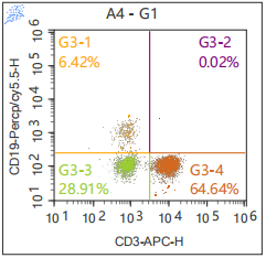 图2. 人外周血染色 Anti-Human CD19, PerCP-Cy5.5(Clone: HIB19)(F11019A04/2)和 Anti-Human CD3, FITC(Clone:SK7) (F11003A01) 的结果。以 FSC/SSC 中的淋巴细胞设门进行分析。