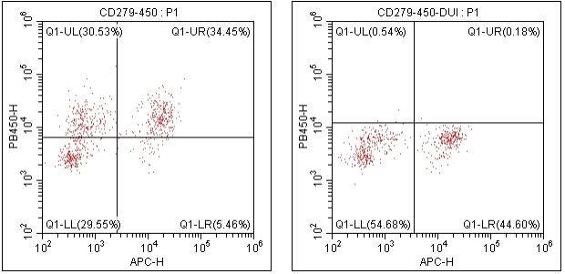 图3. 左图为 Anti-human CD3、Anti-human CD28刺激3天的 PBMC 染色 Anti-Human CD279, mFluor 450(Clone:EH12.2H7) (F1127907) 和 Anti-Human CD4, APC(Clone:SK3) (F11004A03) 的结果。右图为Mouse IgG1 k, mFluor 450(Clone:7D11)Isotype control (F11IG107) 和Anti-Human CD4, APC(Clone:SK3) (F11004A03) 的染色结果,以全细胞进行分析。
