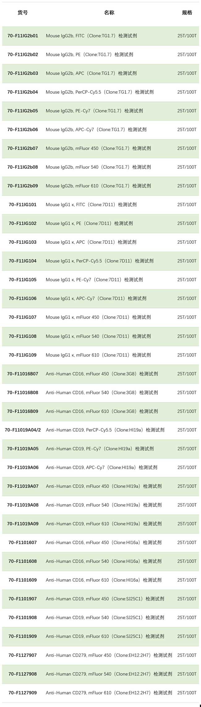 本次新品包括Human CD16、CD19、CD279流式抗体,以及Mouse IgG2b、IgG1 κ同型对照抗体。各个靶标均包含9种荧光标记(包含之前已上架的产品):FITC、PE、APC、PerCP-Cy5.5、PE-Cy7、APC-Cy7、mFluor 450、mFluor 540、mFluor 610。
