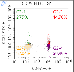 示例图1. 人外周血染色 Anti-Human CD4, APC (F1100403)和Anti-Human CD25, FITC (F1102501/2) 的结果。以 FSC/SSC 中的淋巴细胞设门进行分析。