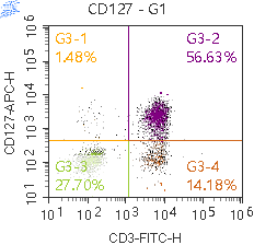示例图2. 人外周血染色 Anti-Human CD3, FITC (F1100301)和Anti-Human CD127, APC (F1112703/2) 的结果。以 FSC/SSC 中的淋巴细胞设门进行分析。
