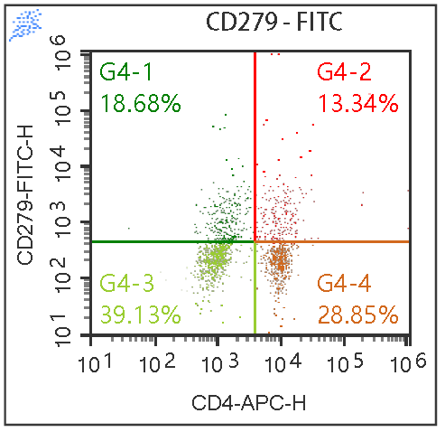 示例图3. 人 PBMC 经 Anti-Human CD3 Monoclonal Antibody, Functional Grade (F11003000) 和Anti-Human CD28, Monoclonal Antibody, Functional Grade (F11028000) 刺激 3 天后,染色 Anti-Human CD4, APC (F1100403) 和 Anti-Human CD279, FITC(F1127901/2) 的结果。已排除粘连细胞。