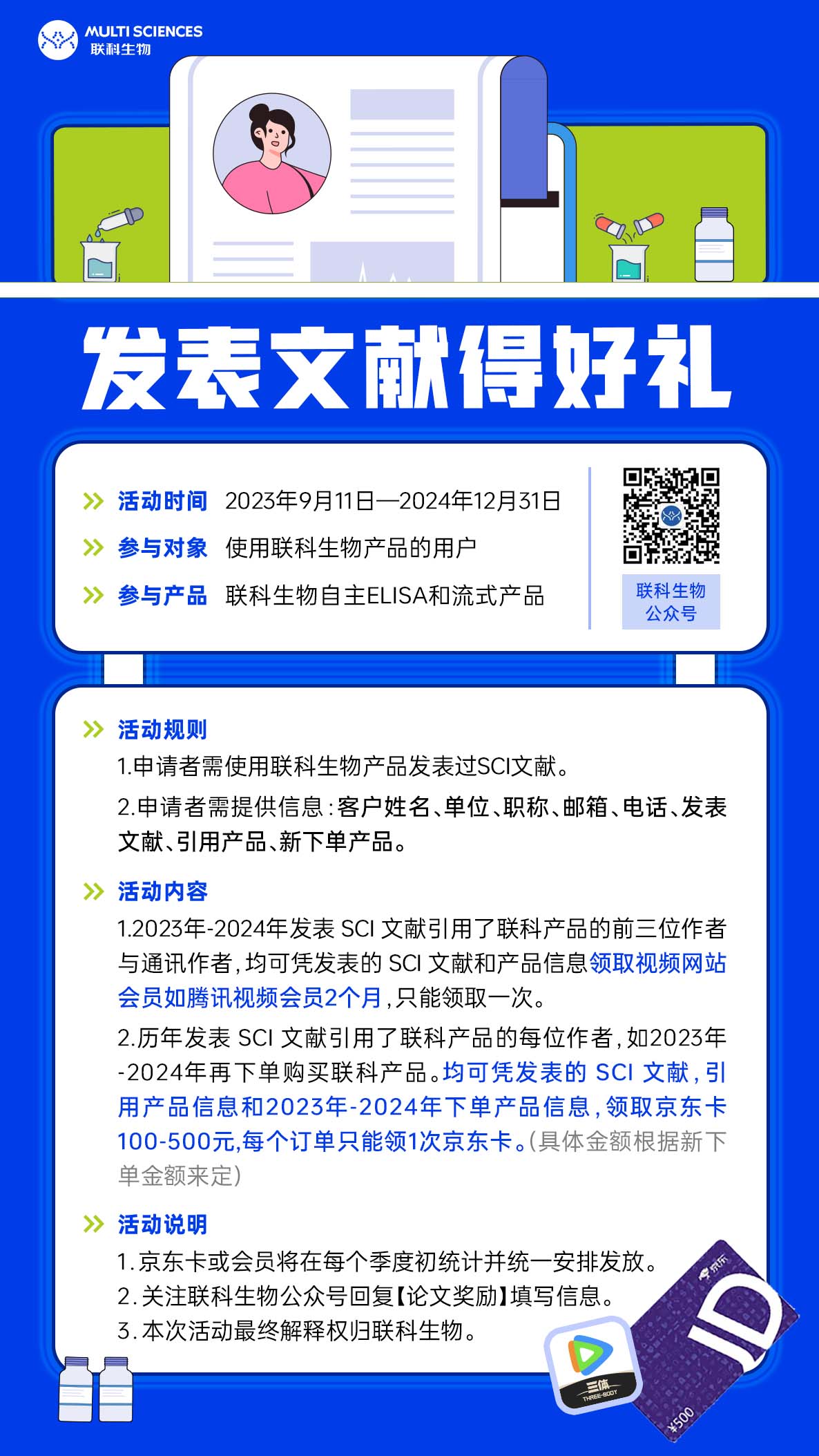 【活动已结束】福利放送 | 发表文献得好礼 Post published:2023-09-12 Post category:市场活动 / 论文奖励Post views:5636 次访问 Read more articles Previous Post联科生物21周年感恩系列活动——金秋时节,联科有礼 Next Post促销活动 | 优质临期(两个月以上)产品大促销!低至2折!快抢! 你可能也喜欢 体重增加和减少对身体产生的影响 2018-01-24 科学家建立循环肿瘤细胞检测新方法 2017-12-28 投票ing!联科生物第十届ELISA大赛正在进行 2025-01-13 DNA体外重组技术蛋白标签抗体 2014-02-14 ELISA推出:Human EGFR/HER1/ErbB1试剂盒 2016-09-12 敲黑板:和师兄师姐谈未来提到的高频词 2019-06-10 联科生物现货供应DNA上样缓冲液 2015-04-02 血清OR血浆,哪个是ELISA的菜 2024-04-15