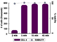 图1.细胞消化。Accutase酶处理人MG63纤维肉瘤细胞,细胞快速脱落,消化为单个细胞,且具有高活力。即使处理45min后,细胞活力仍达到97±3%。
