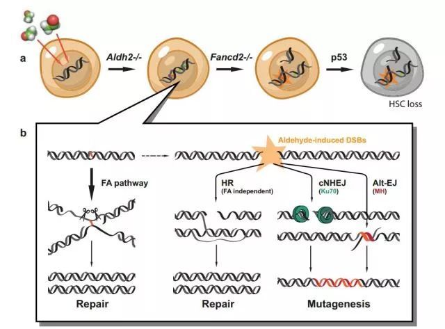 缺乏降解乙醛的酶,会让骨髓细胞的DNA变得不稳定,而酒精能加剧这一现象。