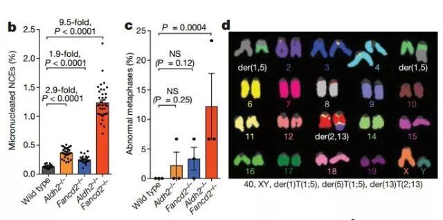 为了确认小鼠的细胞内的确出现了DNA不稳定的现象,研究人员们采用了另一种验证的技术:在细胞内,如果染色体发生断裂,就很容易形成“微核”结构。也就是说,通过计算微核数目有没有变多,就能知道小鼠的DNA是否真的更不稳定。实验结果证实了研究人员的猜想。结果显示,缺乏ALDH2的小鼠,微核数显著增加了2.9倍。