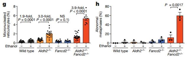 更有趣的是,在酒精的作用下,无论是代表DNA不稳定性的微核数,还是染色体在形态上的异常,都越发严重起来。这些结果也有力地证明,在缺乏乙醛降解能力,且DNA交联修复受影响的动物体内,酒精和其代谢产物能对DNA造成灾难性的后果。