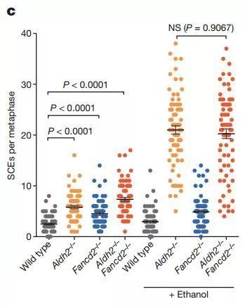 事实也正如研究人员所观察到的那样。研究发现,在ALDH2基因被敲除的小鼠里,骨髓细胞中姐妹染色单体的交换次数上升了2.3倍!这暗示小鼠体内无法得到及时降解的乙醛让DNA变得不稳定,促进了姐妹染色单体的交换。与这个观察一致,在酒精的作用下,突变小鼠骨髓细胞内的姐妹染色单体交换次数猛增4倍!