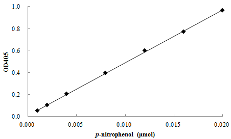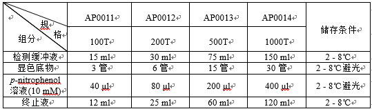 碱性磷酸酶(Alkaline phosphatase)在碱性环境中可催化水解磷酸酯。碱性磷酸酶的表达水平和活性变化与肝脏和骨骼的很多病理状态有关。联科生物的碱性磷酸酶活性检测试剂盒以4-硝基苯磷酸盐为底物,可方便、快捷、灵敏地检测哺乳动物的血清及其它生物样品中的碱性磷酸酶活性。一、试剂盒组分 二、使用方法1.试剂准备:取出所有试剂(包括检测样品),恢复至室温。 标准品工作液:取15 μl p-nitrophenol溶液(10 mM),用检测缓冲液稀释至0.3 ml,最终浓度为0.5 mM。 2.检测方案参考如下。标准品的用量分别为2、4、8、16、24、32和40 μl,推荐设两个重复。样品通常加50 μl,如样品中的碱性磷酸酶活性过高,可减少样品用量或适当稀释后。为消除有色样本本身颜色的影响,需设立样品对照孔,即加入样本,以检测缓冲液代替显色底物的对照。