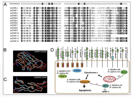2011年公布了鹿角珊瑚Acropora digitifera的基因组序列,这让Quistad及其同事推测TNF受体和配体更古老。鹿角珊瑚就有40个TNF受体和13个配体。