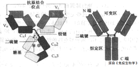 抗体分子呈Y型,其功能由不同的结构域来实现:两臂末端区域称为可变区或V区,起结合抗原分子的作用,不同抗体分子的V区差异非常大;主干区域称为恒定区或C区,其差异很小,主要是结合效应细胞和分子。BCR的C区结合在B细胞膜上,因此其无法结合效应细胞,仅依靠V区识别并结合抗原分子,传递信号引发B细胞活化,最终产生抗体。