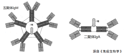 • IgA:分泌型IgA为2个IgA单体通过J链连接形成的二聚体,是外分泌液中主要的抗体类型;