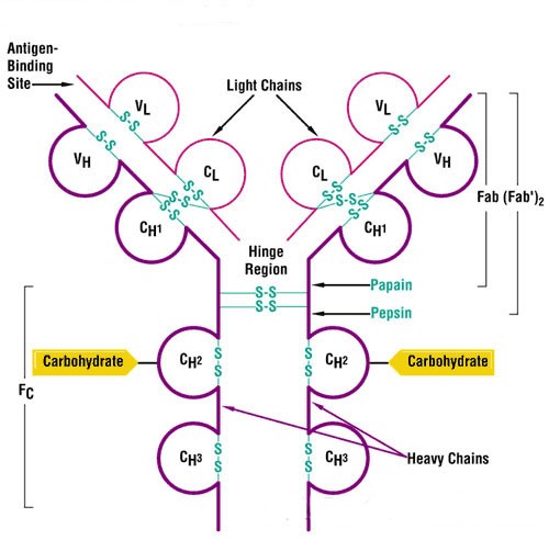 为研究抗体分子不同区域的功能,可利用蛋白酶将抗体水解为不同片段,常见的蛋白酶为木瓜蛋白酶和胃蛋白酶。木瓜蛋白酶的作用位点在铰链区的上方,经过消化后,形成了2个Fab段和1个Fc段,Fab段为抗原结合片段,具有抗原结合活性,而Fc段无抗原结合活性,是抗体分子结合效应细胞或分子的部位;胃蛋白酶的作用位点在铰链区下方,所以2个Fab段仍然连在一起,称为F(ab’)2段,其特异性比完整片段的抗体更好。