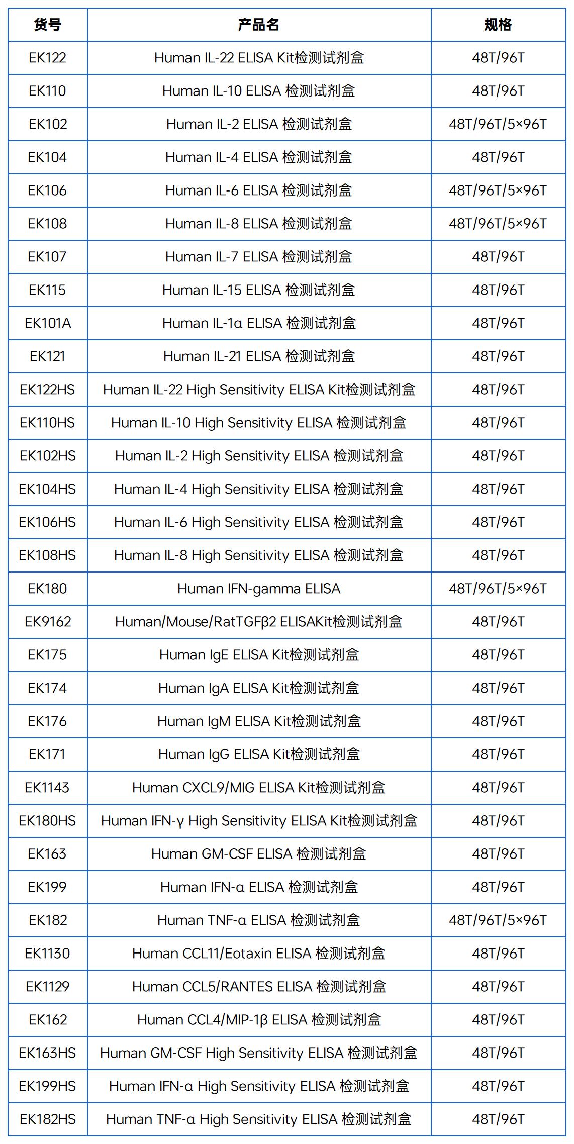 免疫反应的监测:ELISA可以用来检测患者接受细胞治疗后的免疫反应,包括特定抗体的产生和细胞因子的释放,帮助评估治疗的安全性和免疫耐受性。检测血清中IL-2、IL-4、IL-6、IL-10、INF-γ、TNF-α等细胞因子水平,以期反映CAR-T细胞CRS风险。