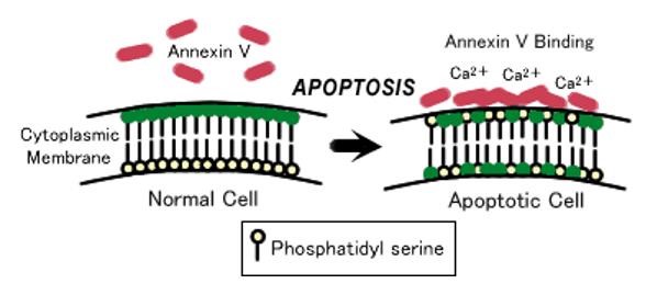 Annexin V是一种磷脂结合蛋白,能够与细胞凋亡过程中被转运到细胞膜外表面的磷脂酰丝氨酸结合。Annexin V应与排除活性染料(如碘化丙啶)联合使用,以确保Annexin V与磷脂的结合发生在细胞膜外表面。
