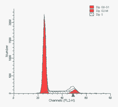 此外,个别染料可以进入活细胞,在不伤害细胞的情况下染色DNA,比如Hoescht 33342。在细胞周期检测中,以低流速线性放大的方式采集样本,然后使用倍性建模软件进行分析,以确定细胞所处的阶段。