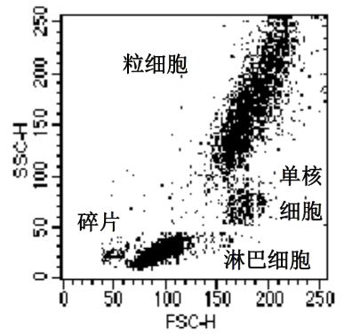 在FSC/SSC双参数点图上可清晰地分出淋巴细胞、单核细胞及粒细胞三群,且碎片很少。