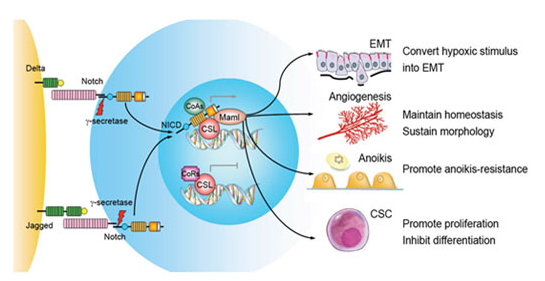 Notch通路是最基本的信号传导系统,使相邻的细胞相互调节、发挥其合适的发育作用。Notch蛋白通过细胞与细胞接触来介导重要的细胞功能。Notch信号传导包括调节胚胎和成年期多种细胞分化进程的基因调控机制。Notch受体是单次跨膜蛋白,包括功能性胞外区(NECD)、跨膜区(TM)和胞内区。在接收信号的细胞中,γ-分泌酶(也参与阿尔茨海默病) 可以在Notch 跨膜区的S3 位点水解,产生Notch 细胞内结构域(notch intracellular domain, NICD)。NICD转移入核与CSL (CBF1/Su(H)/Lag-1)形成复合物,从而激活Myc、p21和HES家族。