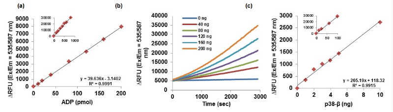 激酶是一类关键的调节酶,可以磷酸化一个细胞内的许多蛋白和转录因子。这个过程可在癌症和炎症等多种疾病结果中被上调或下调。近来,制药公司集中大量注意力在鉴定和开发新的、特异性的小分子激酶抑制剂作为药物。 BioVision已经开发了一种ADPsensor™ 通用激酶活性检测试剂盒(Cat # K212-100),用于荧光检测通过激酶形成的ADP。该检测步骤简单,只需3步,HTS兼容,非放射性过程并可以检测最低1 ng 的活性激酶。 Figure: (a) ADP标准曲线(0-200 pmol and 0-1000 pmol); (b) 40-200 ng的重组Her2 (Cat. # 8011) 激酶活性检测; (c) 1-100 ng的p38-β (Cat # 7763-5) 激酶活性检测。 |