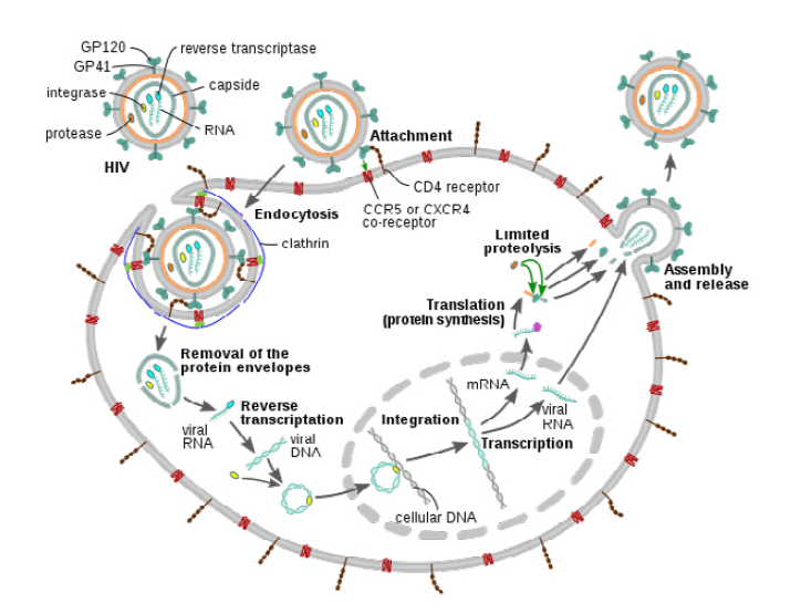图显示艾滋病毒附着在受体上以进入免疫细胞