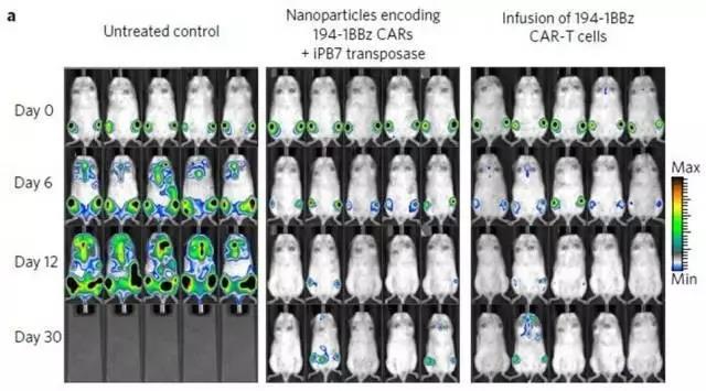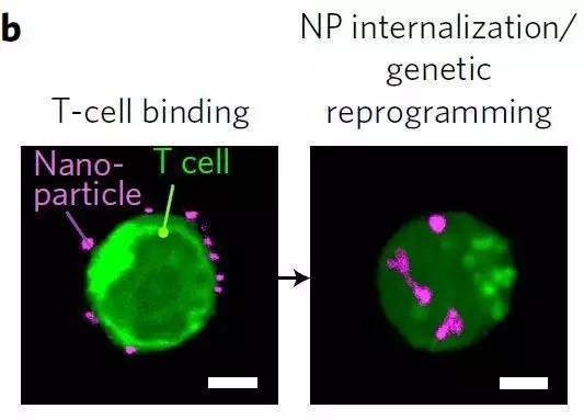 研究人员首先在将纳米颗粒与脾细胞一起培养。发现携带CAR基因的纳米颗粒确实能够改造T细胞、使其表达CAR。接下来他们又将携带CAR基因的纳米颗粒注入小鼠体内并对其进行了研究。发现在注射4h后,纳米颗粒与外周循环中的T细胞发生了结合,并且在小鼠的脾脏、淋巴结和骨髓中分布最高。
