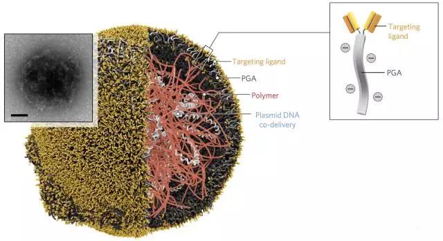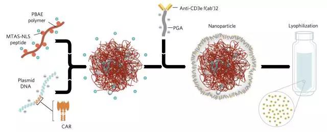 第二,化疗增加了风险。为了给CAR-T细胞腾出空间,患者必须接受化疗,这虽然能够抑制癌细胞,但却会“伤及无辜”,正常的免疫细胞也会遭到破坏。Juno公司的CAR-T临床II期试验中,两名患者由于接受化疗而导致脑水肿先后死亡[6]。 第三,治疗成本之高绝非一般患者所能承受。英国有关分析机构称,对于急性淋巴细胞白血病(ALL)的年轻患者,采用CAR-T治疗的费用可能高达64.9万美元[3]。 上面的三大问题主要是由T细胞需要在患者体外接受改造造成的。如果能有一种方法让特定的T细胞在患者体内就变成「特种兵」CAR-T细胞,问题就迎刃而解了。 Stephan及其团队作为CAR-T治疗领域的老兵,在提升CAR-T治疗效果方面颇有建树。4月下旬,他们团队还给CAR-T做了个支架,直接丢到实体瘤上,可以解决CAR-T治疗实体瘤不好的问题。 这一次,他们打算通过纳米载体将CAR基因运输到特定的T细胞内。Stephan博士团队的设计思路并不复杂。他们首先把包含CAR的基因片段和可以进入T细胞核里的物质连接,组成一个四周带正电的纳米团;然后再把带负电的可以找到T细胞的物质包裹在这个纳米团的外面。如此一来,在静电引力的作用下,就形成了一个直径在150nm左右的稳定纳米颗粒。