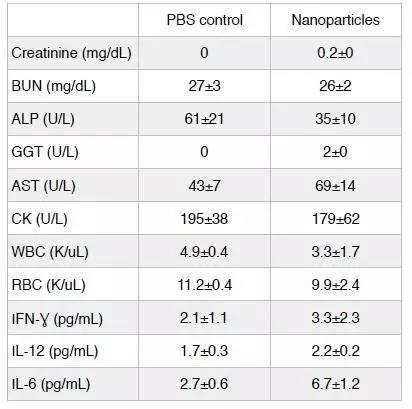 之后,研究人员又对其毒性进行了测试。对小鼠各项指标进行检测发现:注射纳米颗粒的实验组小鼠与注射磷酸盐缓冲液的对照组小鼠相比并无差异。这表明纳米颗粒是无毒的。