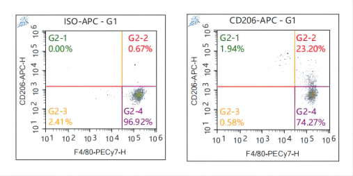小鼠腹腔巨噬细胞进行染色,左图为Anti-Mouse F4/80, PE-Cy7和Rat IgG2a,κ, APC染色结果,右图为Anti-Mouse F4/80, PE-Cy7和Anti-Mouse CD206, APC染色结果。