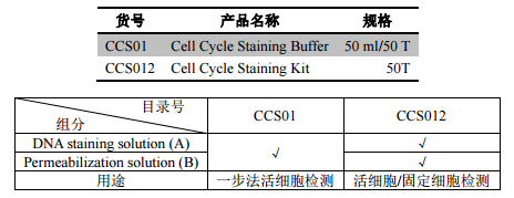 | 联科生物可以提供两种细胞周期检测试剂盒,在组分上,#CCS01是DNA染色液和破膜剂的混合装;#CCS012为DNA染色液和破膜剂的独立包装。在用途上,#CCS01可用于一步法活细胞细胞周期检测,固定细胞也可用,但推荐用#CCS012效果更佳;#CCS012可用于活细胞和固定细胞的细胞周期检测。