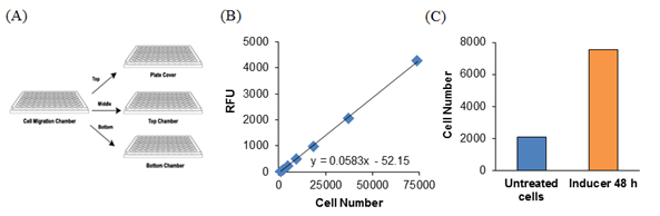 | 细胞迁移是正常生物过程的基础,包括胚胎发育、血管生成、伤口愈合、免疫反应和炎症。这些过程发生错误会导致严重的后果,包括智力残疾、血管疾病、肿瘤的形成和转移。BioVision的EZCell™细胞迁移/趋化性检测试剂盒(K906-100, K907-100,K908 -100,K909-12,K910-12,和K911-12)利用博伊登室Boyden chamber, 细胞在不同刺激下通过半透膜迁移。这些检测不需要细胞标记,刮洗或计数,从而大大节省您的时间。主要特点: ⇒ 安全方便 ⇒ 直接:不需多余步骤 ⇒ 多种规格:K906-100 (96-well, 8 μm), K907-100 (96-well, 5 μm),K908-100 (96-well, 3 μm), K909-12 (24-well, 8 μm), K910-12 (24-well, 5 μm), and K911-12 (24-well, 3 μm) ⇒ 高通量适用性 ⇒ 荧光定量 EZCell™ Cell Migration/Chemotaxis Assay kits (96-well, 3 μm) (K908-100) (A) 细胞迁移室的示意图 (B) 红白血病细胞的标曲 (C) 细胞迁移: 红白血病细胞饥饿过夜后用对照迁移诱导物处理48小时(黄色)或不处理(蓝色:对照组) |