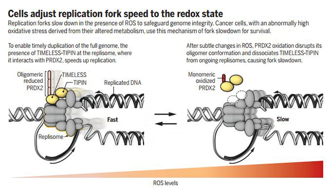 整个生命过程中,人类的细胞不停分裂,产生新的细胞。在这个过程中,细胞通过调节DNA复制的速度对代谢波动作出反应,以此作为基因组稳定性的保证。11月10日发表在Science上的一篇文章阐明了如何让复制叉动力学响应代谢途径的细胞学机制。研究人员还展示了他们可以操纵这个节律,并建议用来杀死癌细胞。