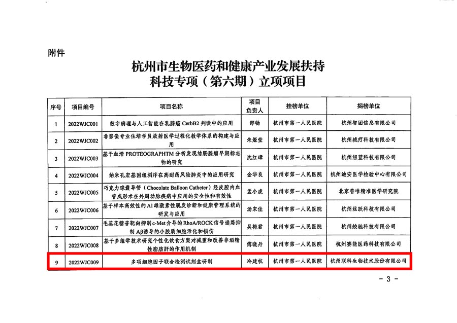 热烈祝贺联科生物“多项细胞因子联合检测试剂盒研制”被列入“杭州市生物医药和健康产业发展扶持科技专项”支持项目!再次获得杭州市科技专项支持。