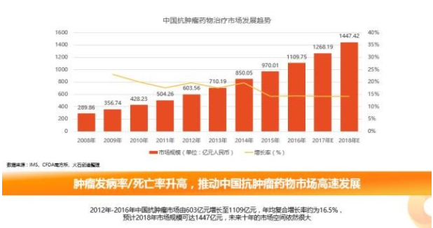 肿瘤发病率/死亡率的不断升高,推动抗肿瘤药物市场不断高速发展。据IMS数据显示,2014年全球用于治疗肿瘤的药物费用为1000亿美元,远高于其他疾病的用药开销,成为全球第一大药物市场。