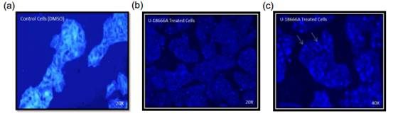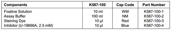 简介:胆固醇是动物细胞膜基本结构的组成部分。它在膜结构完整性和和流动性中起到作用。胆固醇也是一些激素的合成前体,如胆汁酸、Vd。质膜包含了大部分的胆固醇(80 - 90%),小部分的胆固醇存在内质网和线粒体膜中。脂类物质主要分为两大类: ? 脂肪(主要是甘油三酯)是人体内含量最多的脂类,是体内的一种主要能量来源; ? 类脂,是生物膜的基本成分,约占体重的5%,除包括磷脂、糖脂外,还有很重要的一种叫胆固醇(cholesterol)。 样本类型:细胞 试剂盒组分: 检测结果: 肝细胞(HepG2细胞)胆固醇染色:HepG2细胞培养过夜。第二天用U18666A(1.25 UM)或对照(DMSO)处理48小时。 1.用DMSO证明大部分胆固醇是位于处理细胞的质膜。 2.用U18666A 48小时导致了胆固醇在细胞内积累。 2.高倍图像B.图像的拍摄。 http://www.biovision.com/manuals/K587.pdf |